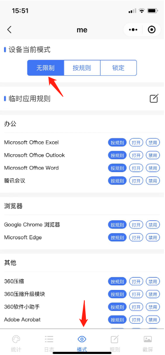如果您清楚是什么原因导致的锁定,可直接关闭或修改相应限制策略即可;如果您不太清楚被锁定的原因,但现在要急着用设备,可在“设备>模式”页面下切换到“无限制”模式(见下图),即可解除锁定(注意,想要修改的策略立刻在设备上生效,请确保设备是在线的)。
